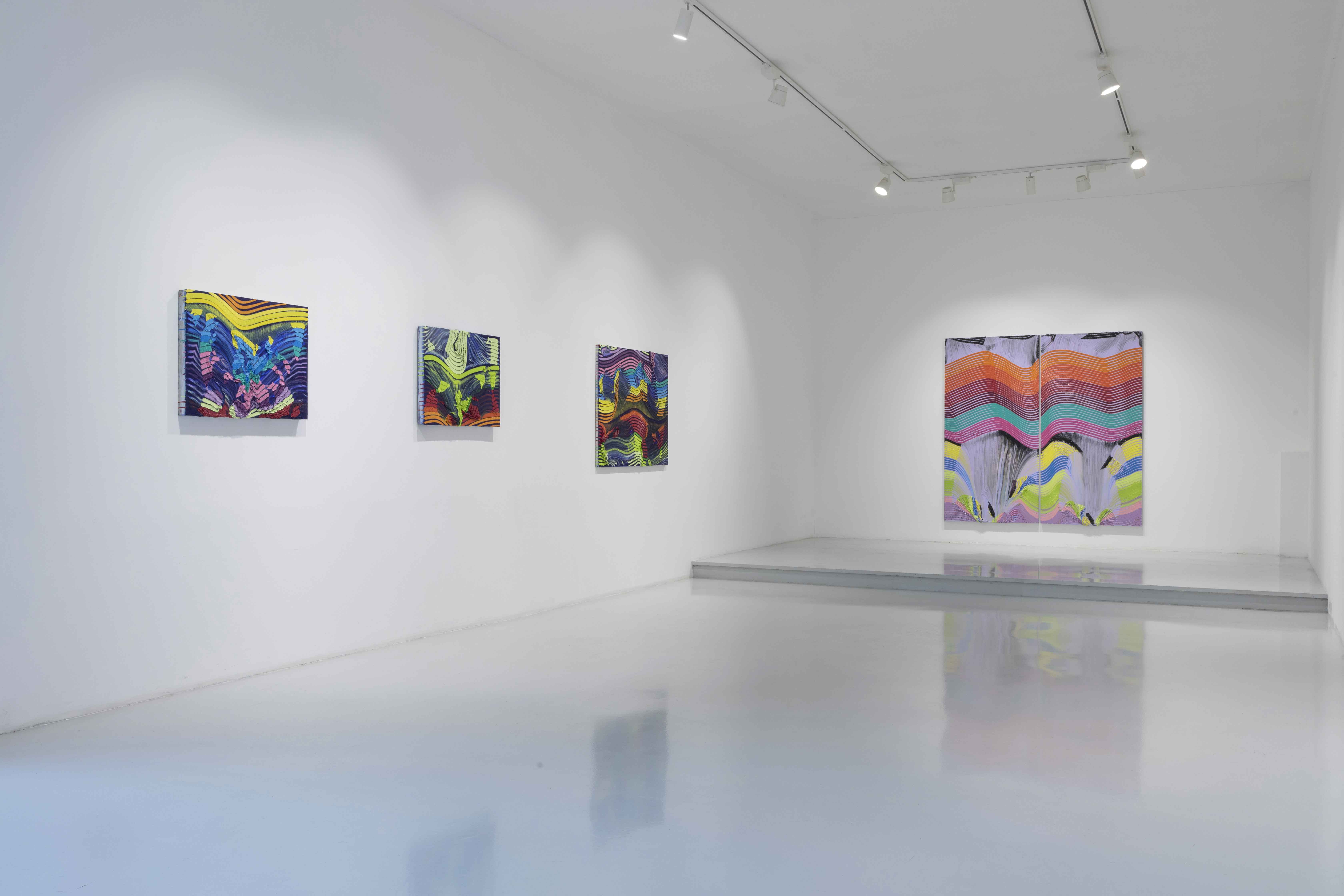 I believe Painting is essentially unstable and hypersensitive. I’m addicted to the changing conditions and situations one can enter through making paintings. The Skin Horizon paintings feel flexible and open, direct and reactive. They seem to be able to absorb the molecules and ideas of the world into them, directly into their surfaces! They go through the similar strains and movements that our bodies go through, as well as re-creating geological and entropic movement; all lit via a heightened sense of Urban colour; I want time itself to shape the surface and image. -